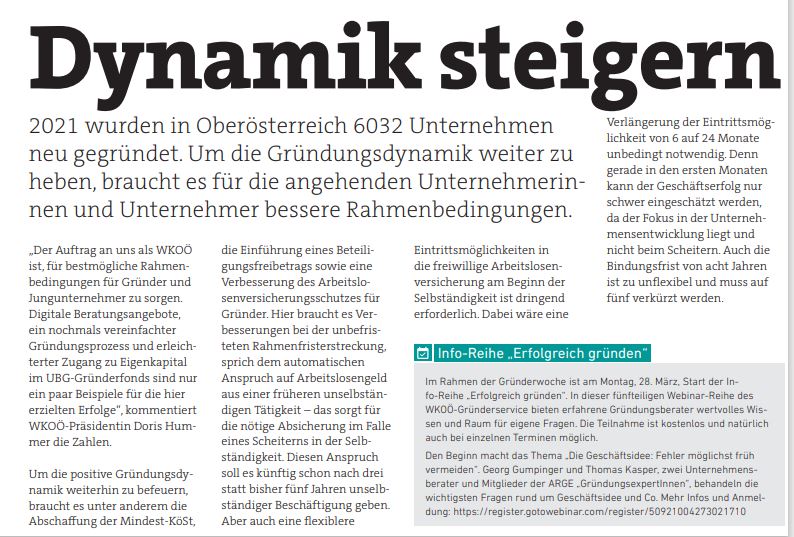 “Dynamik steigern – Erfolgreich GrĂŒnden” (Wirtschaftskammerzeitung OĂ, MĂ€rz 2022)